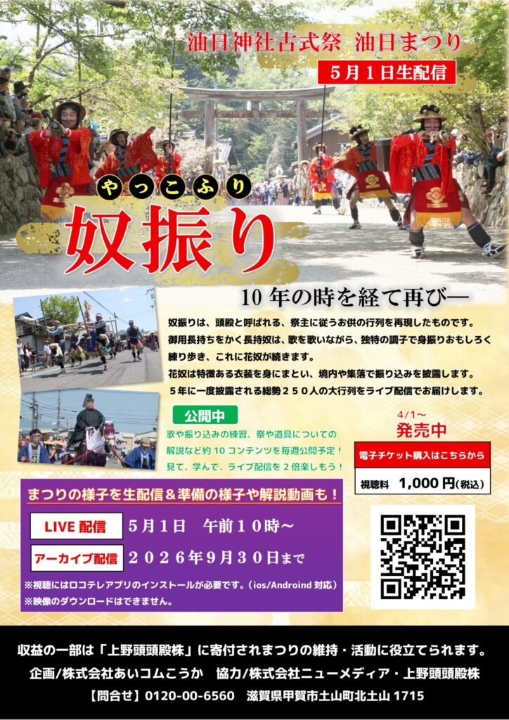 5月1日の油日まつりで10年ぶりに行われる「奴振り」。あいコムこうかではその模様を生放送でお届けします。